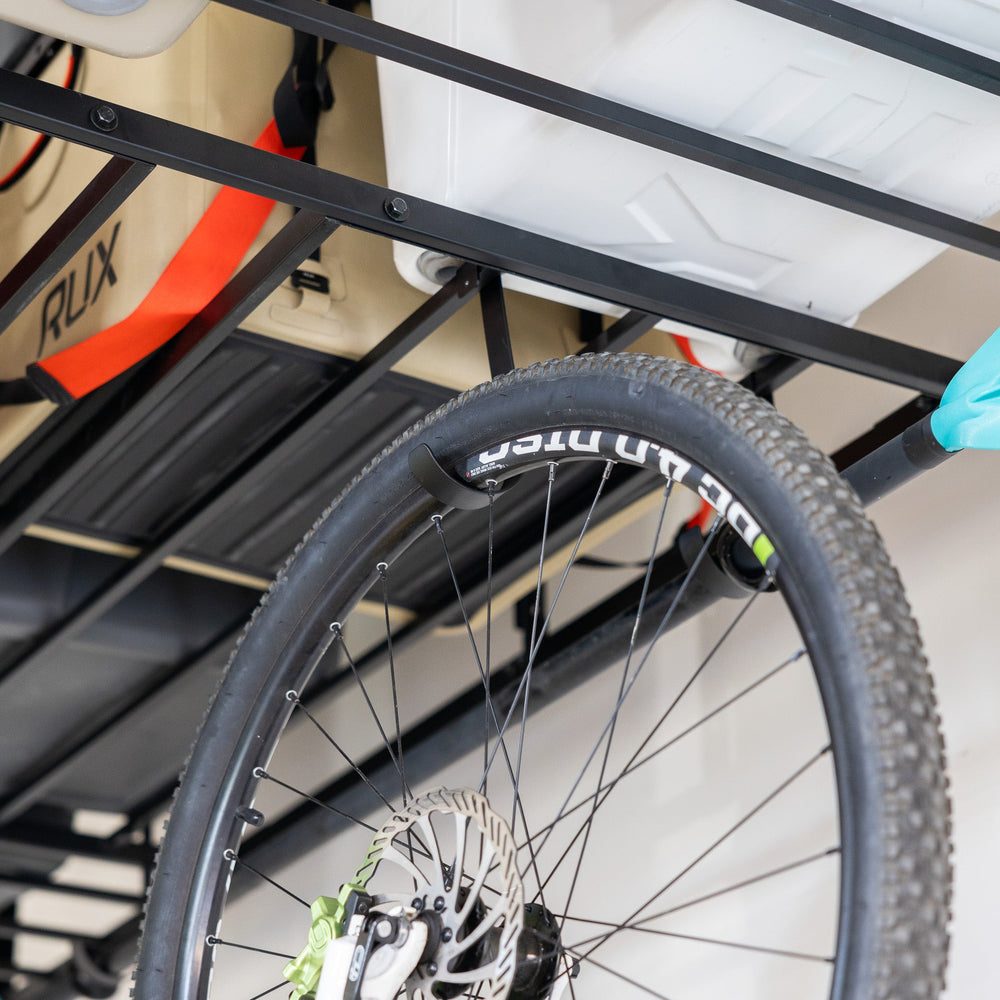 Make room for cars in your garage by leveraging wasted ceiling space for storage. This ultra-heavy-duty, modern-style overhead shelving comes with a set of hooks to conquer even more clutter with hanging storage.