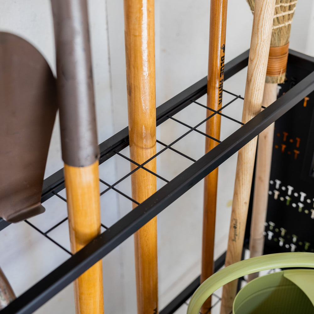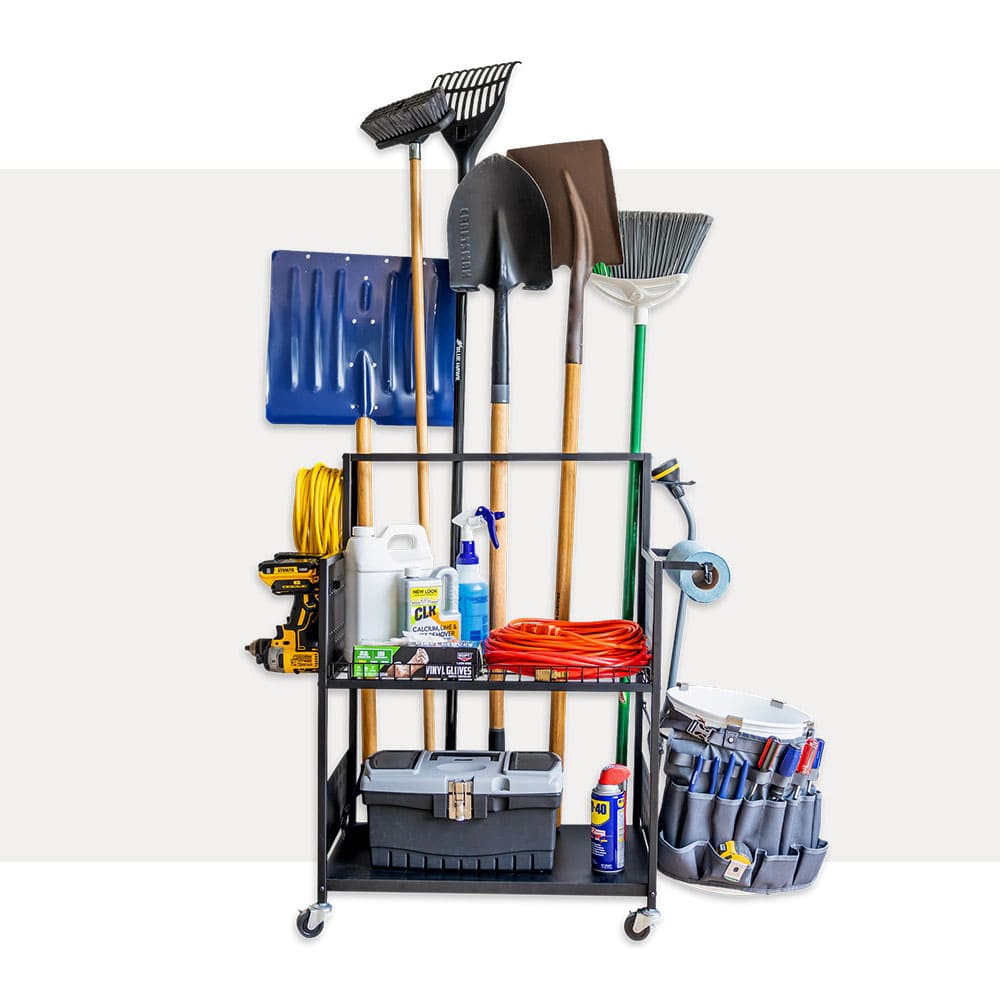 - Organize garden tools, brooms, mops, hand tools, buckets, spray bottles, paper towels, and more.