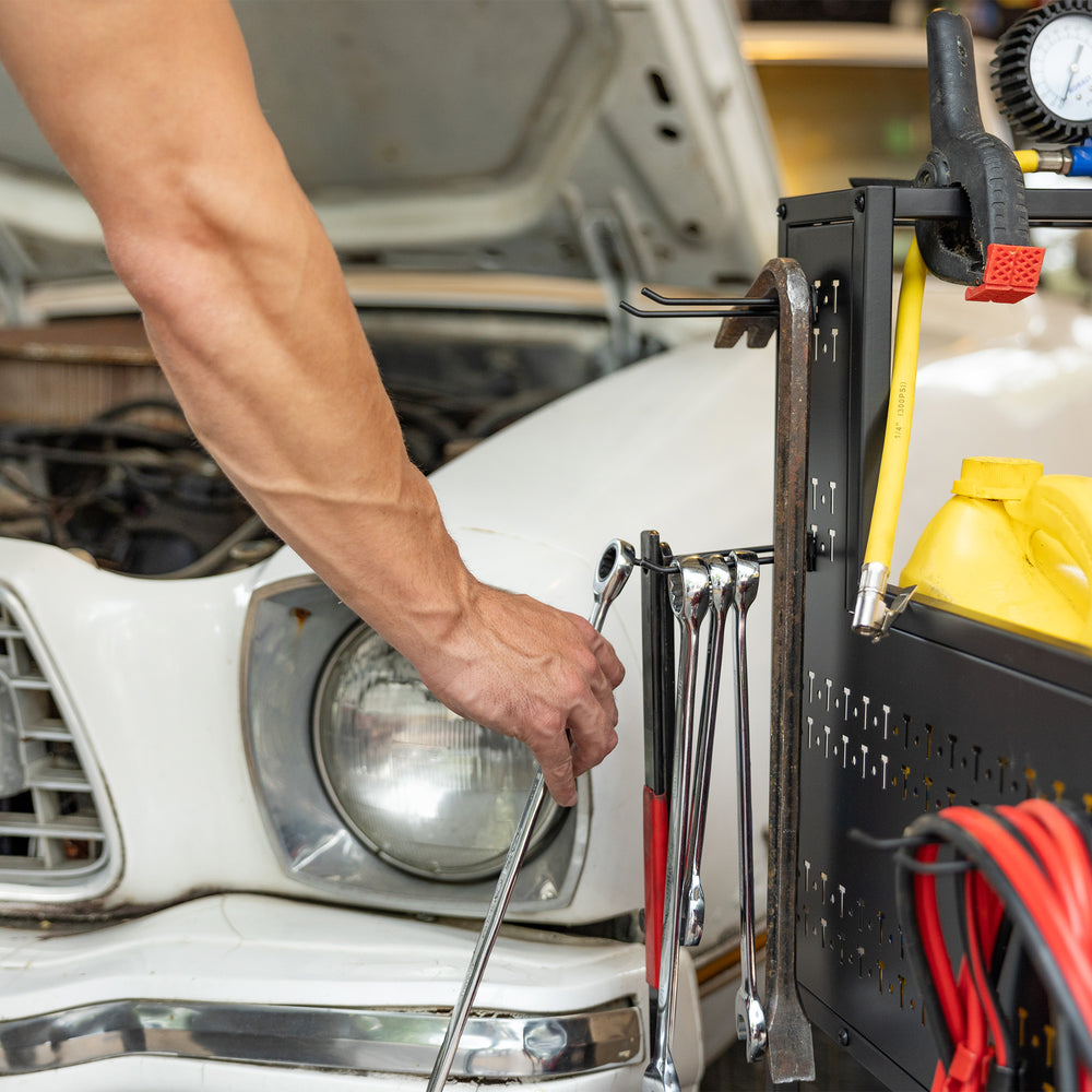 - Proprietary pegboard panels on each side include 4 storage attachments to hang smaller tools.